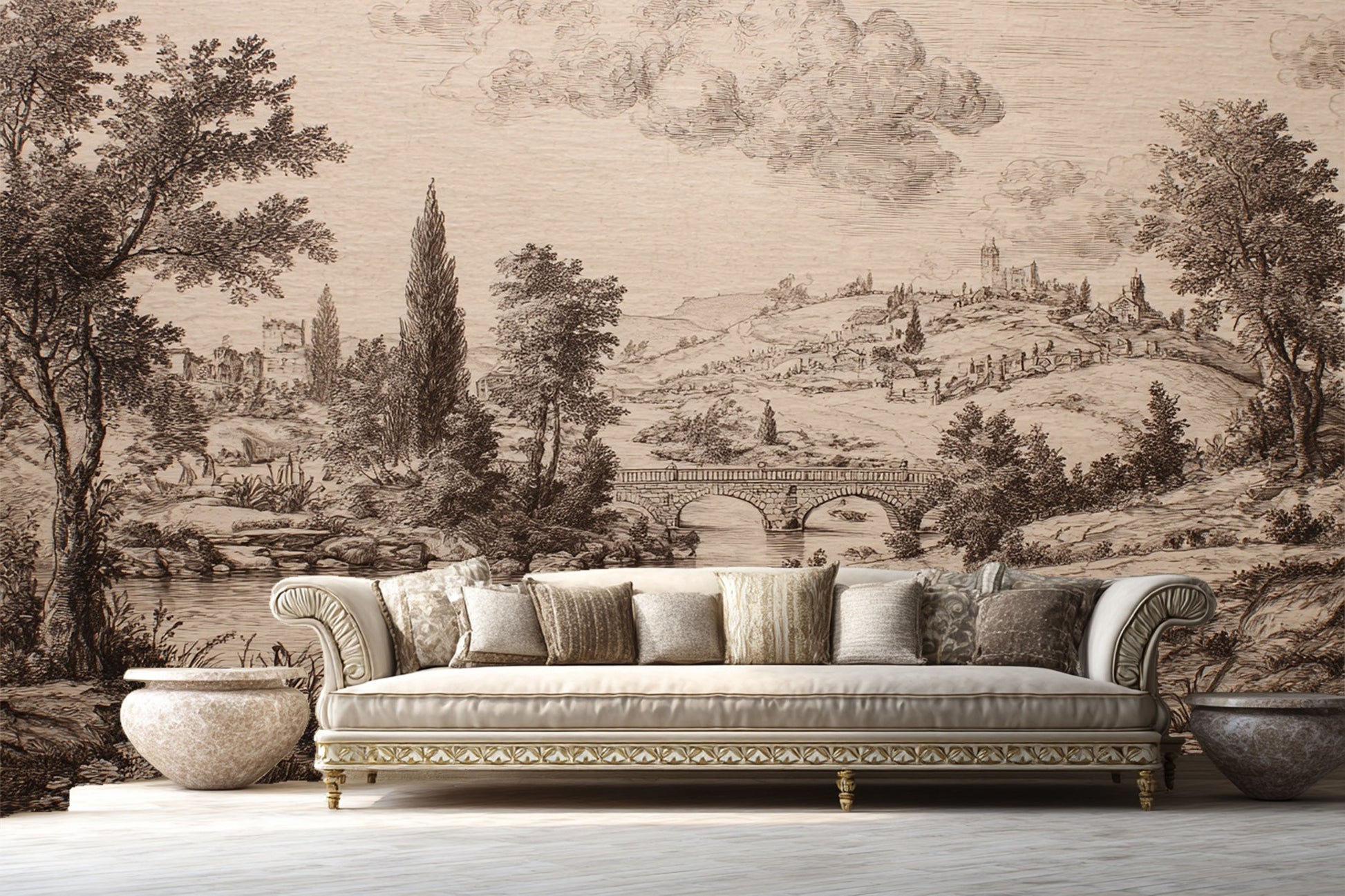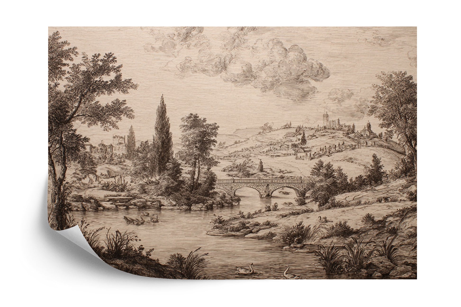 Tapeta Alveron to hołd dla klasycznej sztuki pejzażowej – delikatna, monochromatyczna rycina przedstawiająca spokojny nurt rzeki, otoczony majestatycznymi drzewami, mostem i malowniczym wzgórzem w tle. Jej szlachetny, rysunkowy charakter wprowadza do wnętrza atmosferę dawnych europejskich rezydencji, pełnych harmonii i nostalgii. Idealnie dopełni przestrzenie w stylu klasycznym, vintage lub modern classic, nadając im artystycznego wymiaru i ponadczasowej elegancji.