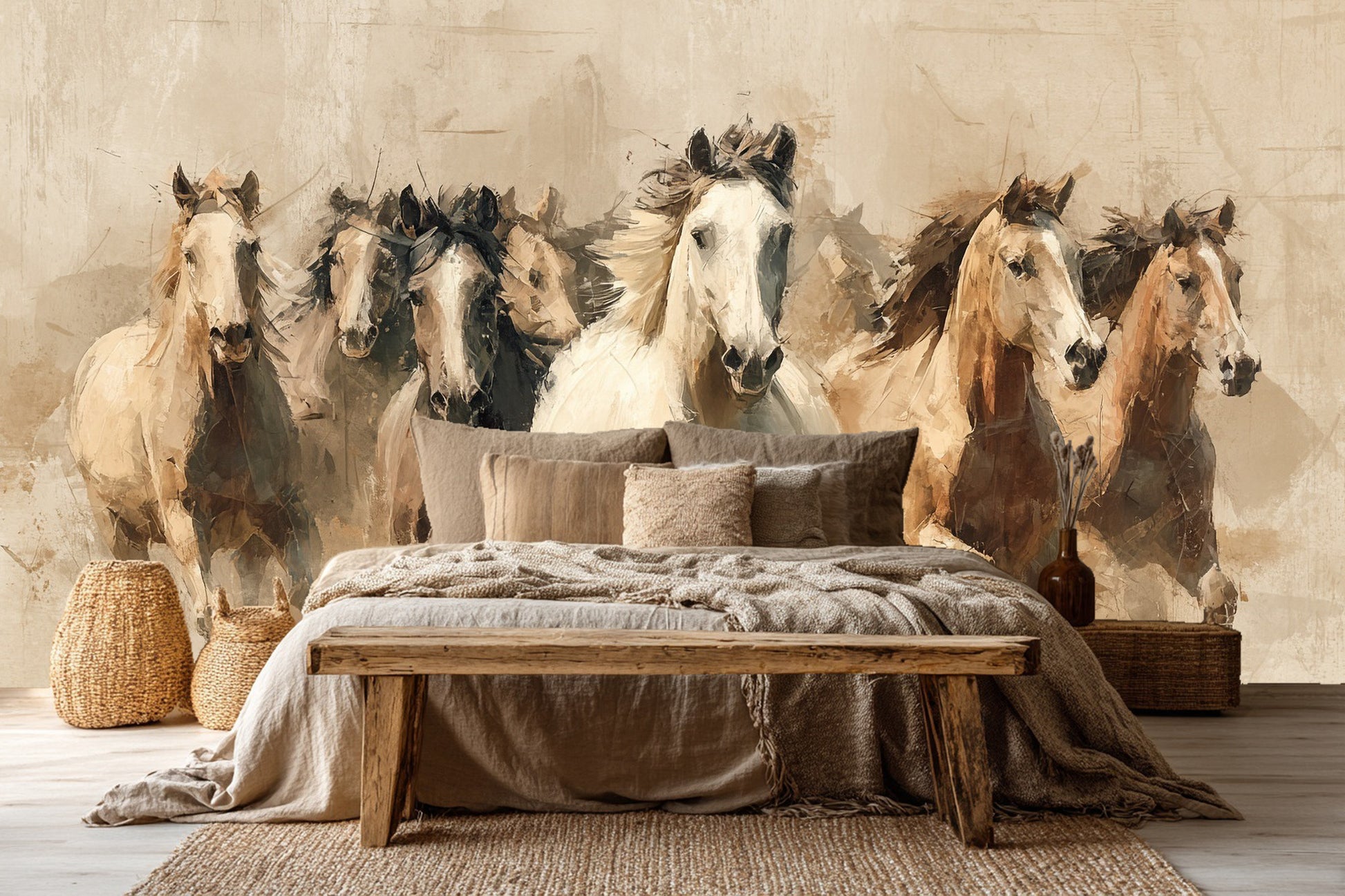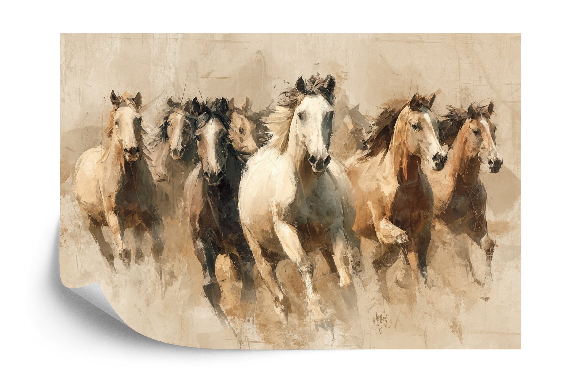 Tapeta Eryvon emanuje nieokiełznaną siłą i wolnością. Stado koni galopujących w harmonii tworzy obraz czystej energii i majestatu natury. To wyjątkowa dekoracja, która wnosi do wnętrza dynamikę, szlachetność oraz poczucie przestrzeni bez granic.