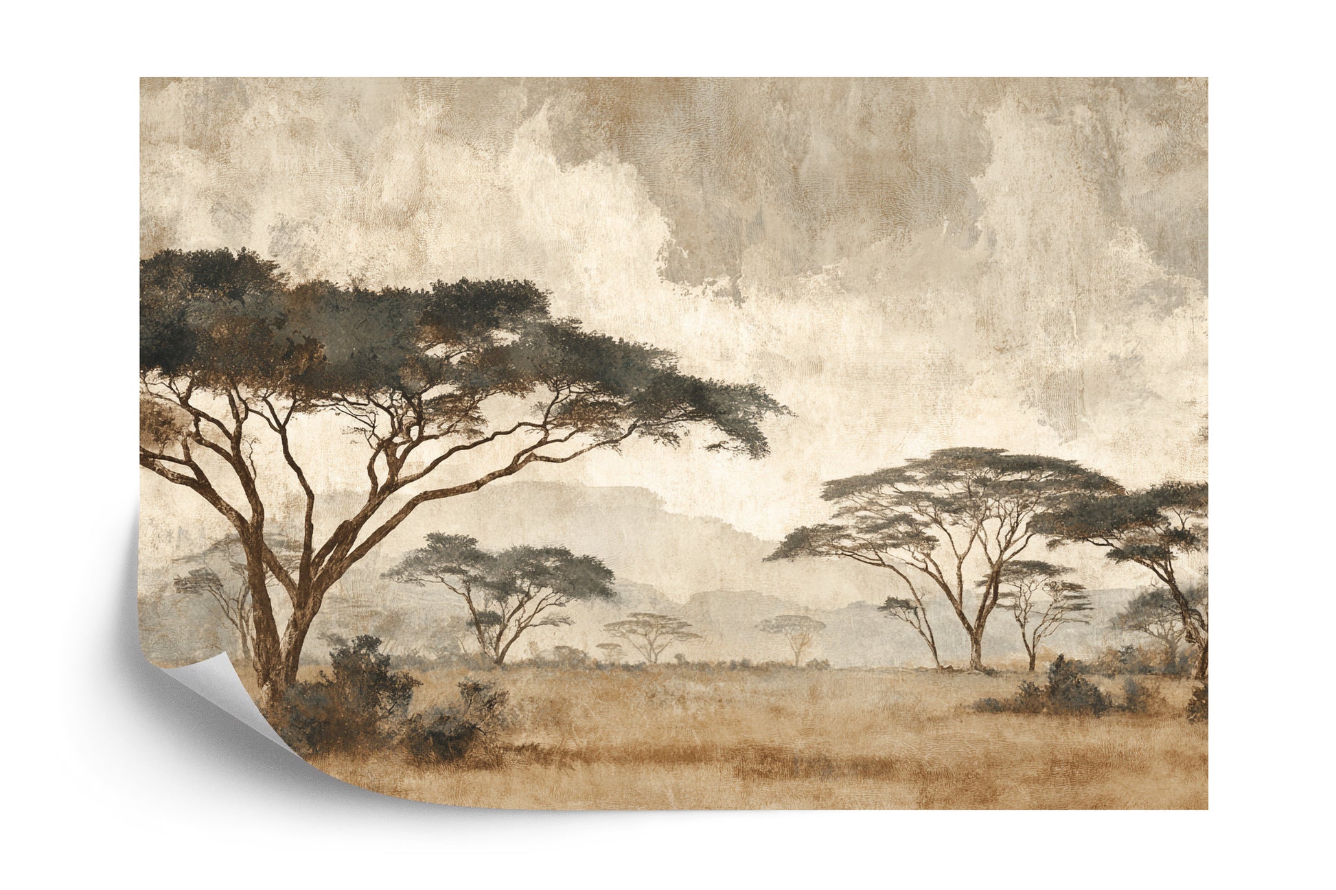 Fototapeta „Savora” przenosi Cię na afrykańską sawannę, gdzie majestatyczne akacje rozciągają się po horyzont, a ciepłe beżowo-brązowe tony nadają wnętrzu przytulności i elegancji. Subtelna faktura malarska tworzy efekt głębi, wprowadzając do przestrzeni spokój i egzotyczny klimat. Idealna do salonu, gabinetu lub przestrzeni inspirowanych naturą i podróżami.