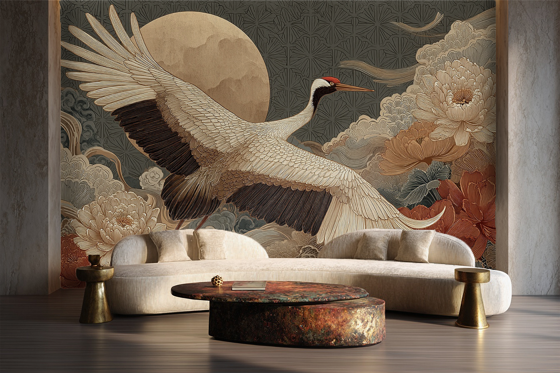 Tapeta Tsuyora to połączenie majestatu i harmonii – przedstawia żurawia w locie na tle pełni księżyca, wśród kwitnących kwiatów i falujących obłoków. Symbolizuje długowieczność, szczęście i duchowe uniesienie. Ciepła paleta barw i misterny rysunek tworzą aurę spokoju i luksusu, idealną do wnętrz, w których sztuka spotyka się z naturą.