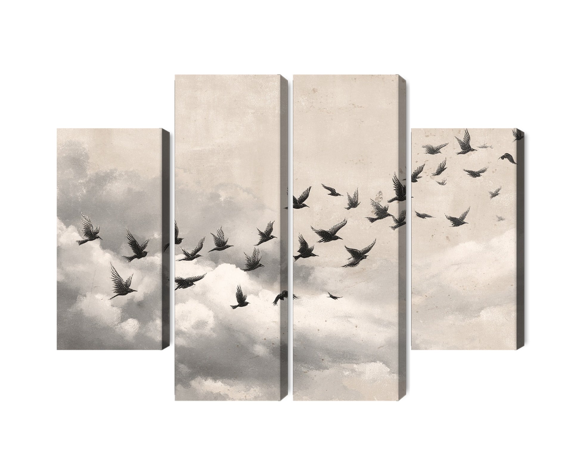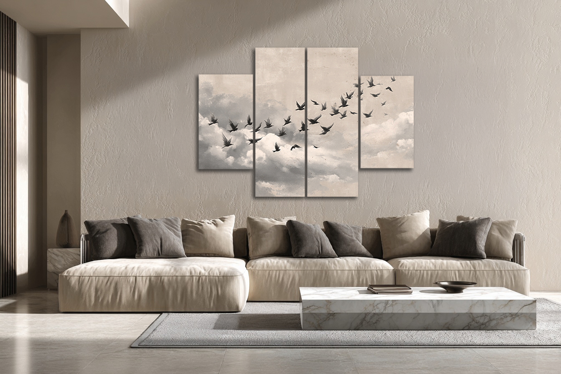 Obraz wieloczęściowy „Aeloria” przedstawia klucz ptaków unoszących się ponad miękkimi obłokami. Minimalistyczna paleta barw w odcieniach szarości i beżu nadaje dziełu subtelnej elegancji, a symbolika wolności i spokoju wprowadza do wnętrza lekkość oraz harmonię. To idealny wybór dla miłośników nowoczesnych aranżacji i ponadczasowych dekoracji.