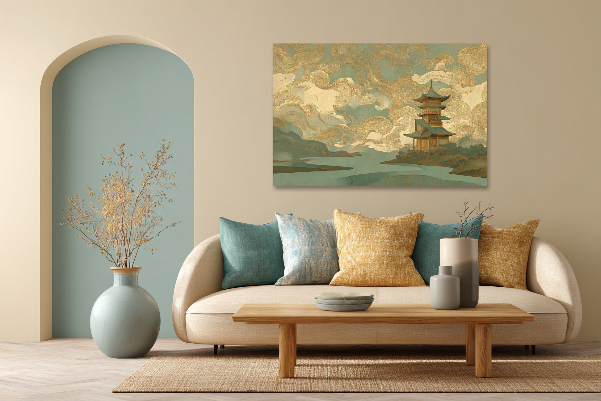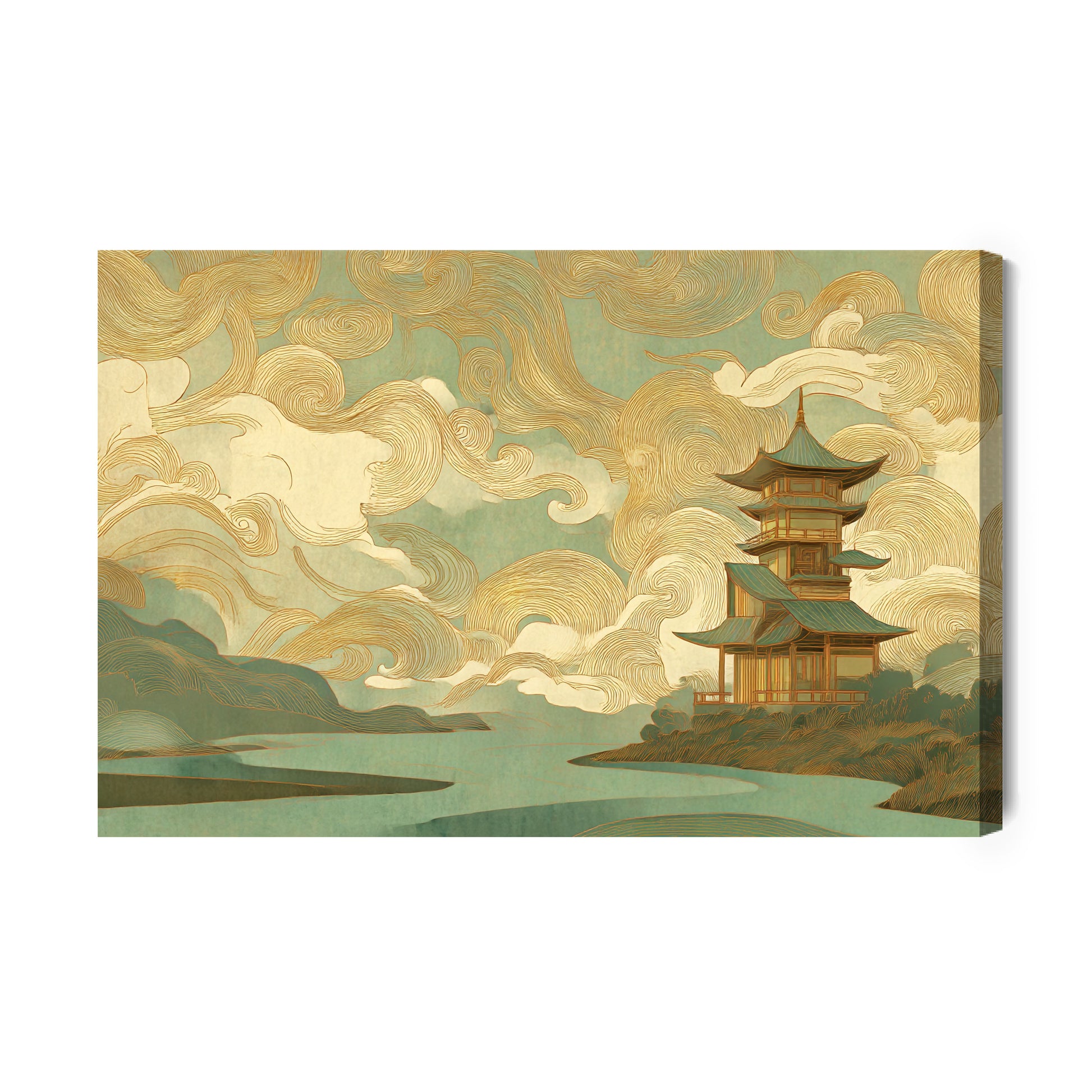 Obraz na płótnie przedstawiający tradycyjną japońską pagodę otuloną złocistymi chmurami. Subtelne połączenie turkusu i złota wprowadza atmosferę mistycyzmu, spokoju i duchowej harmonii. Idealna dekoracja dla wnętrz, które pragną odrobiny orientalnej elegancji i ponadczasowego uroku.