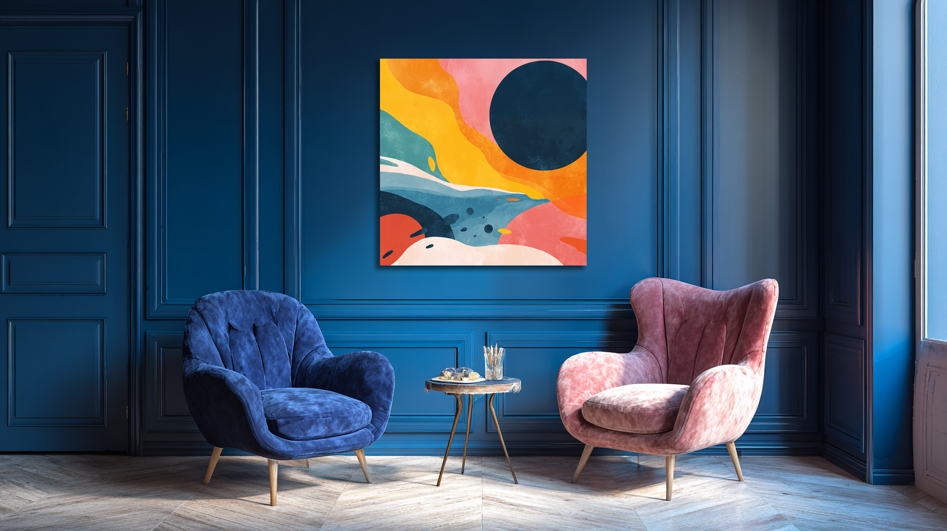 Nowoczesna abstrakcja pełna dynamiki i energii. Intensywne barwy i płynne formy tworzą kompozycję, która ożywia przestrzeń i nadaje jej wyjątkowego charakteru. To obraz, który emanuje ekspresją i nowoczesnym stylem, przyciągając uwagę od pierwszego spojrzenia.”