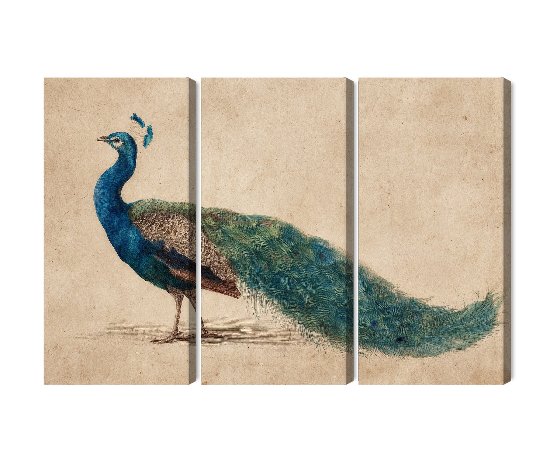 „Plume” to elegancka ilustracja pawia utrzymana w subtelnym, vintage’owym stylu, która przyciąga uwagę spokojną kolorystyką i dopracowaną strukturą piór. Delikatne, ręcznie wyglądające kreski i miękkie odcienie zieleni oraz błękitu nadają pracy naturalnego charakteru, jednocześnie zachowując luksusowy wyraz. Tło w tonacji postarzanego papieru sprawia, że całość wygląda jak odnaleziony w archiwach fragment starej, botanicznej księgi. W wersji wieloczęściowej obraz prezentuje się jeszcze dostojniej — długi ogon pawia pięknie „płynie” przez kolejne panele, tworząc wyraźny, harmonijny rytm. To dekor, który wprowadza do wnętrza spokojną elegancję i poczucie ponadczasowego smaku.