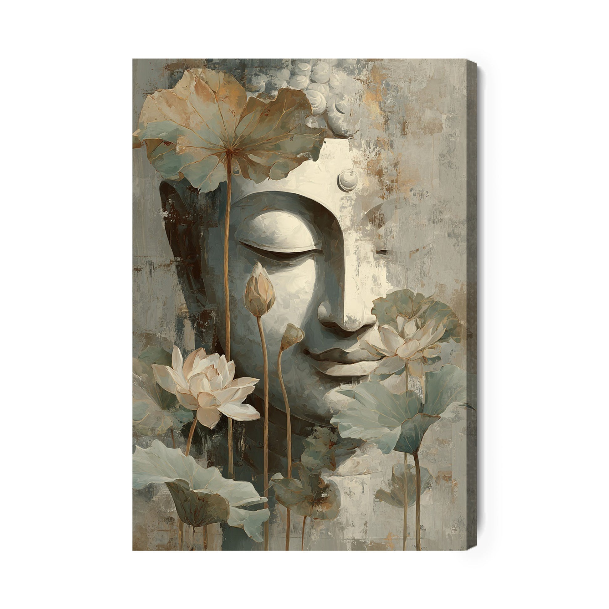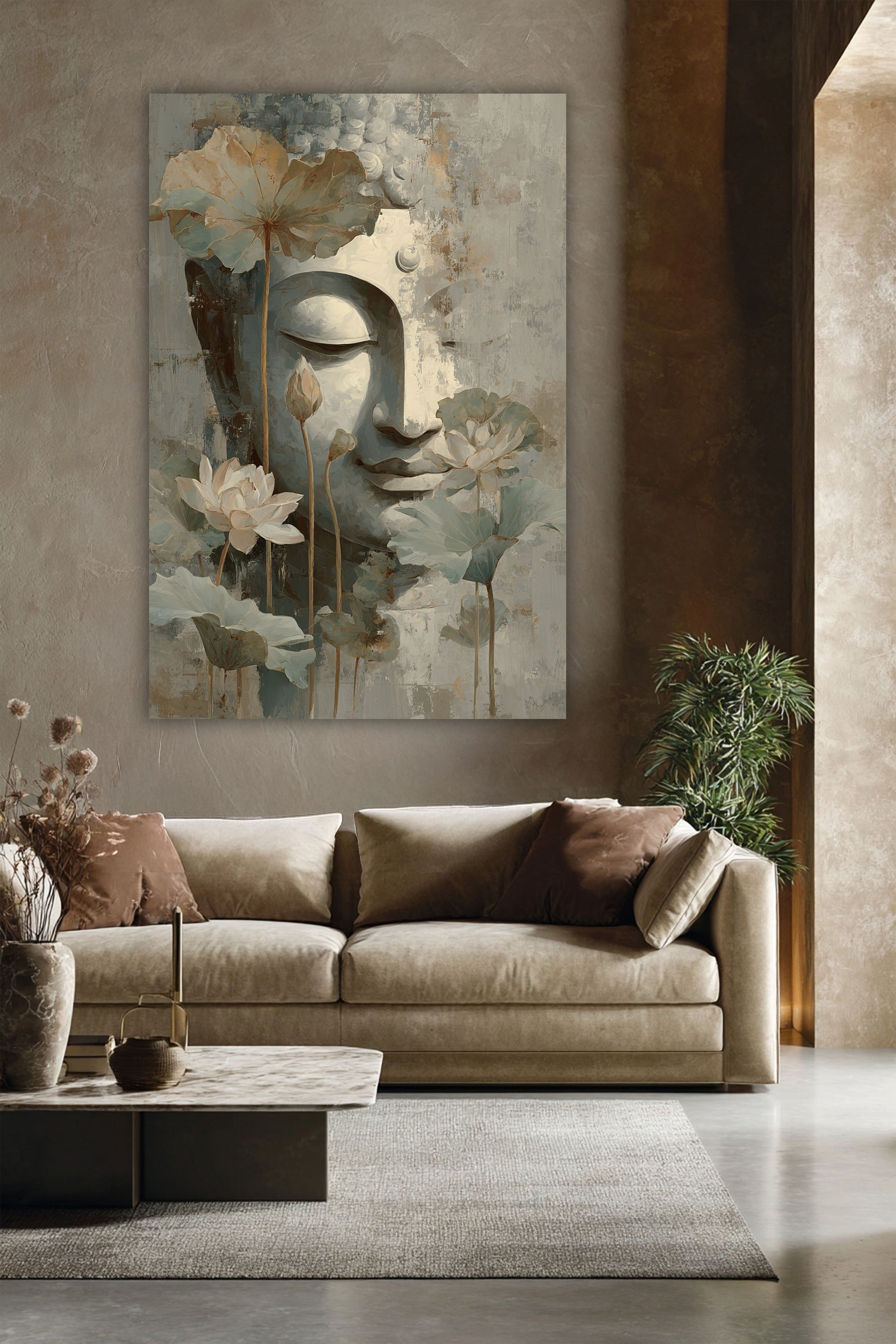 Obraz Seyora przedstawia spokojne oblicze Buddy otoczonego kwiatami lotosu – symbolami czystości i odrodzenia. Stonowana paleta barw, łącząca odcienie beżu, zieleni i bieli, nadaje dziełu harmonijny, medytacyjny charakter. To wyjątkowa kompozycja, która wnosi do wnętrza poczucie wyciszenia, duchowej głębi i ponadczasowej elegancji.