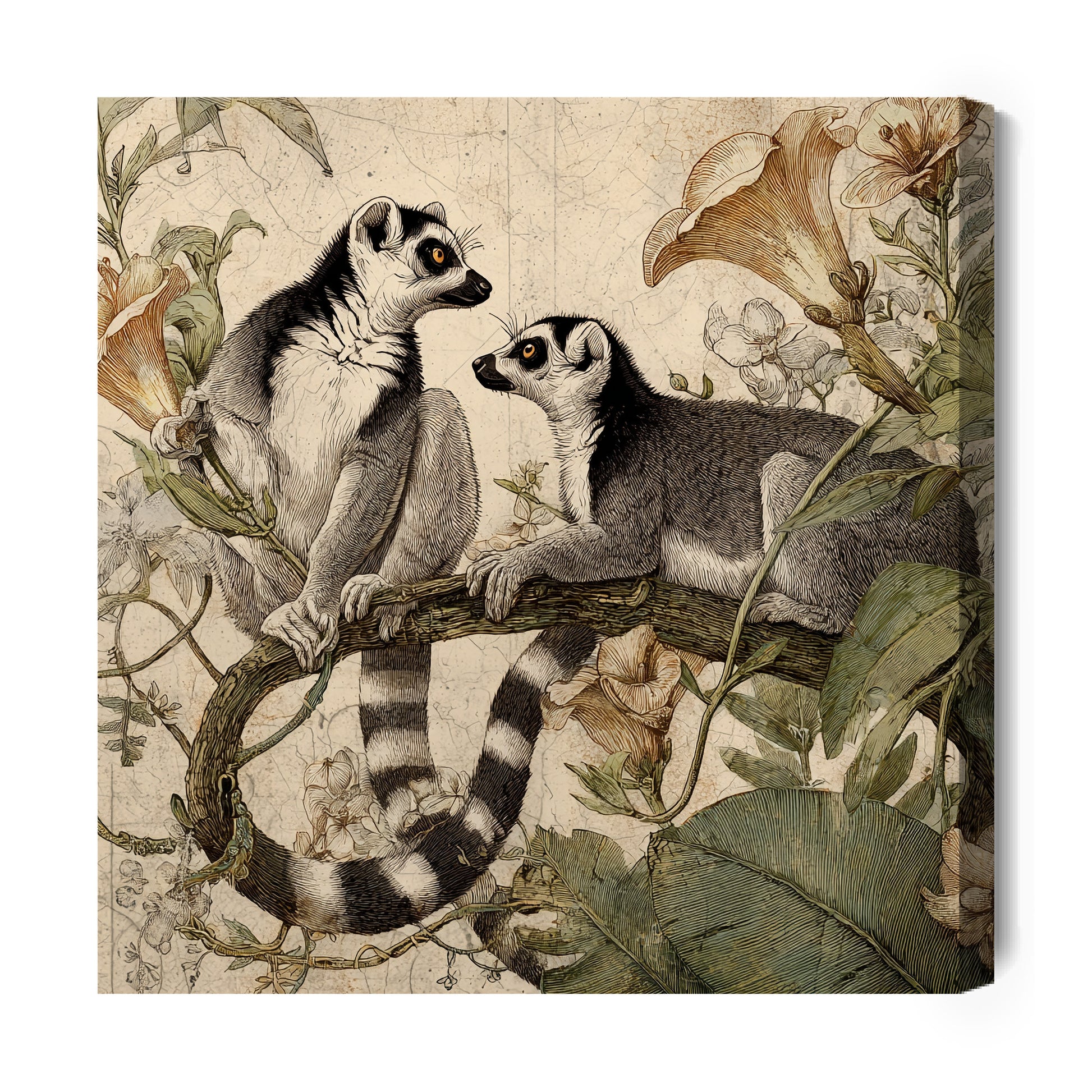 Pełna uroku scena, w której dwa lemury spoczywają na gałęzi pośród bujnej roślinności. Delikatne barwy i precyzja detalu nadają obrazowi naturalny charakter i subtelną elegancję. To dzieło wprowadza do wnętrza atmosferę egzotyki, harmonii i ciepła.
