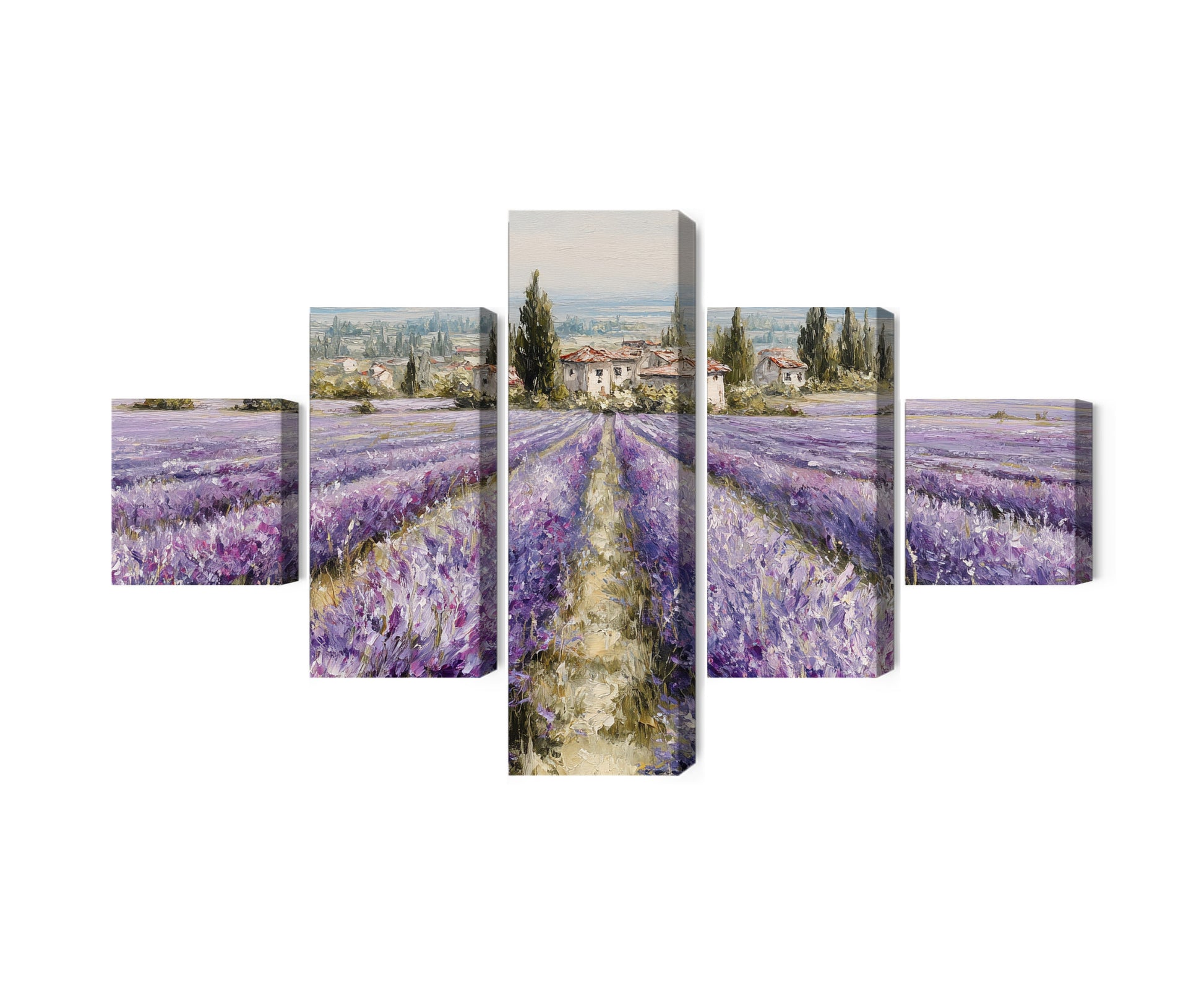 „Valeris” to panoramiczna kompozycja przedstawiająca rozległe pola lawendy, rozciągające się aż po horyzont. Rytmiczny podział na panele potęguje wrażenie perspektywy, a fiolety i zielenie tworzą świeży, ale wyważony kontrast. Obraz emanuje spokojem i naturalnym porządkiem, przywołując skojarzenia z letnim światłem i otwartą przestrzenią. To dekor, który rozjaśnia wnętrze i nadaje mu lekkości.