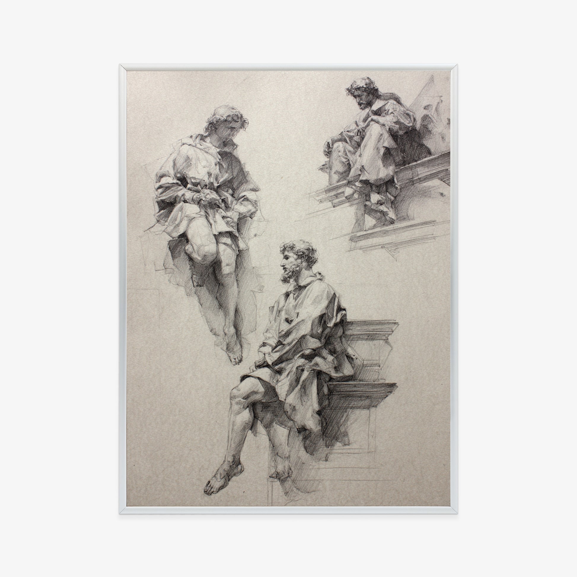 „Figurae” to ilustracyjna kompozycja inspirowana klasycznym rysunkiem postaci, w której ruch i forma przenikają się w subtelny, niemal szkicowy sposób. Postacie wydają się uchwycone w przejściowym momencie — pomiędzy gestem a bezruchem — co nadaje obrazowi wrażenie lekkości i artystycznej niedopowiedzialności. Całość emanuje spokojem i elegancją, przywołując skojarzenia z tradycyjnymi pracowniami artystycznymi.