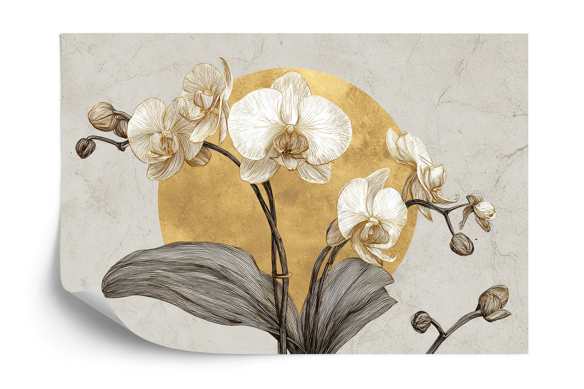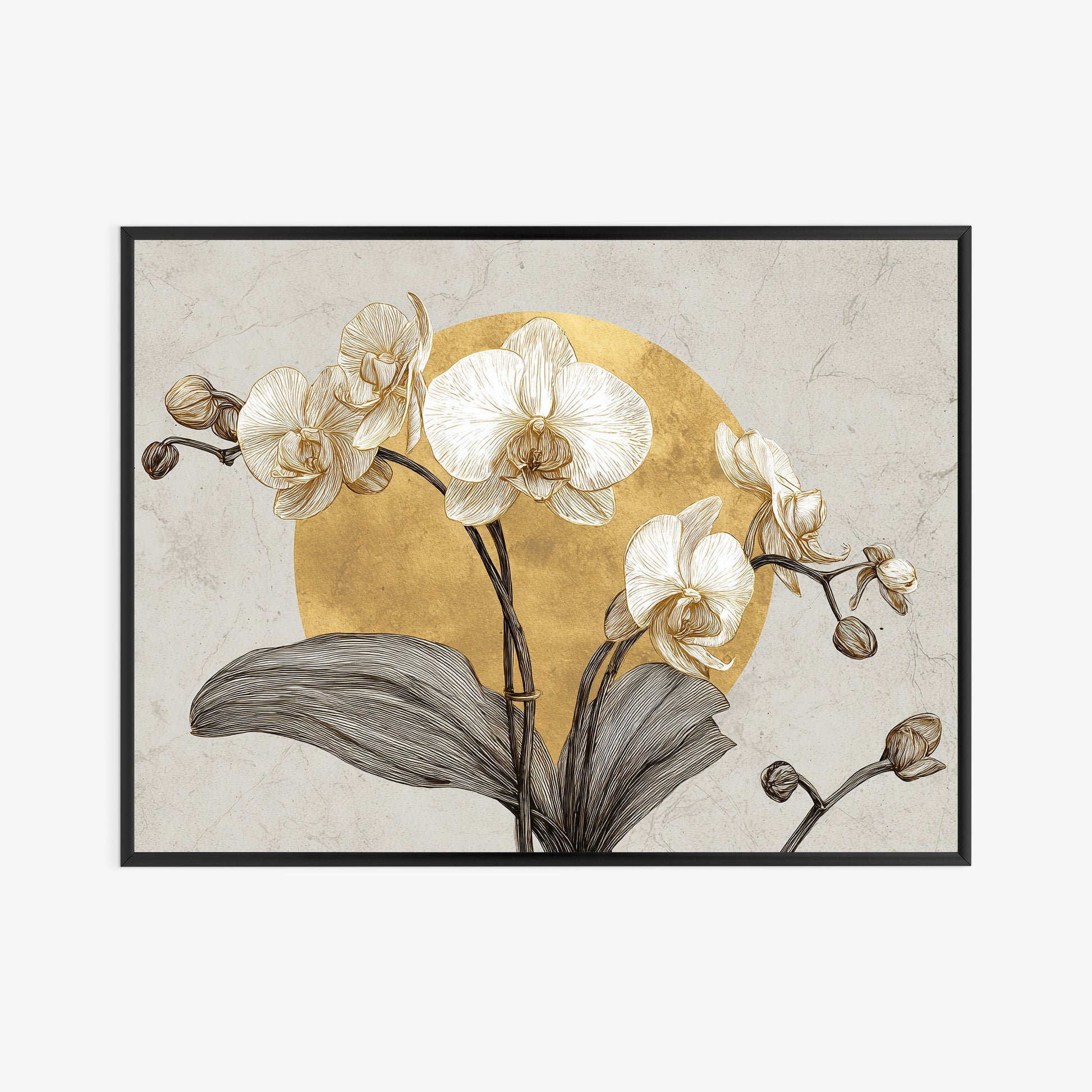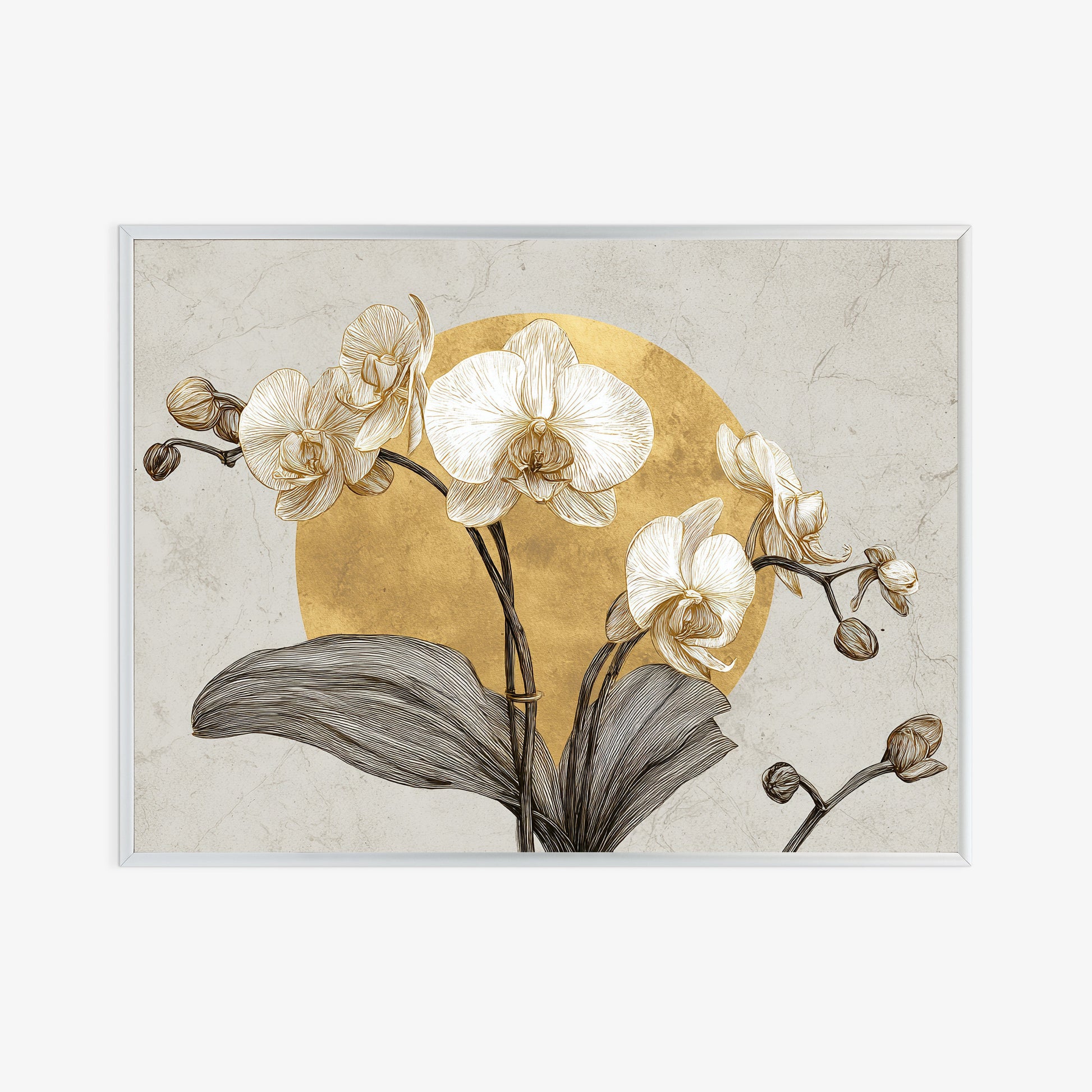 Plakat przedstawiający białe orchidee skąpane w złotym blasku. Subtelne połączenie botanicznej precyzji i artystycznego minimalizmu tworzy dekorację pełną harmonii i elegancji. Idealny wybór do wnętrz nowoczesnych, klasycznych i glamour – wprowadzi aurę luksusu i delikatności w Twojej przestrzeni.