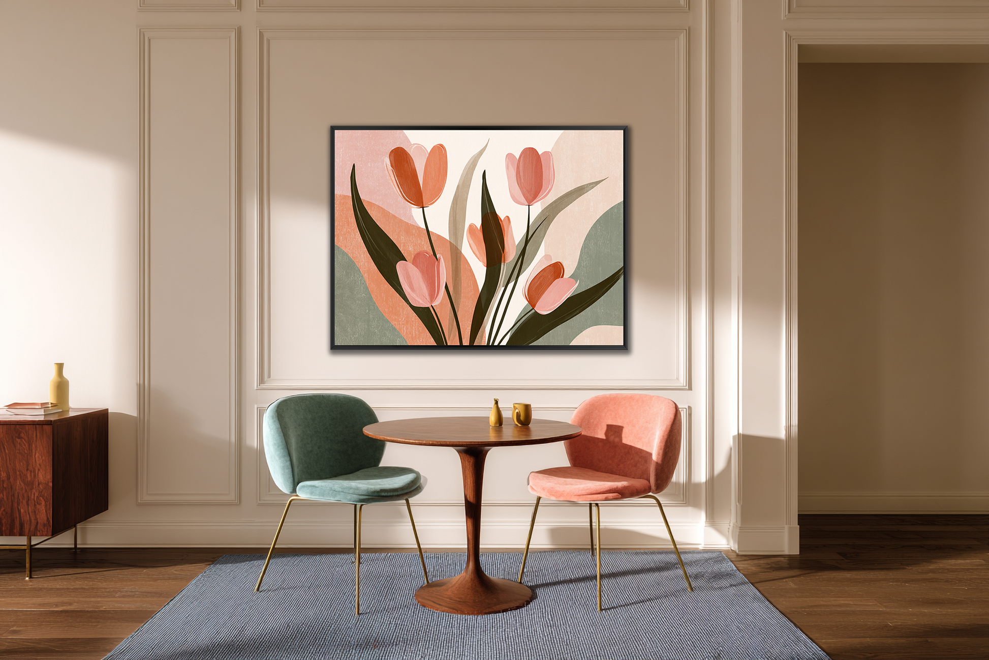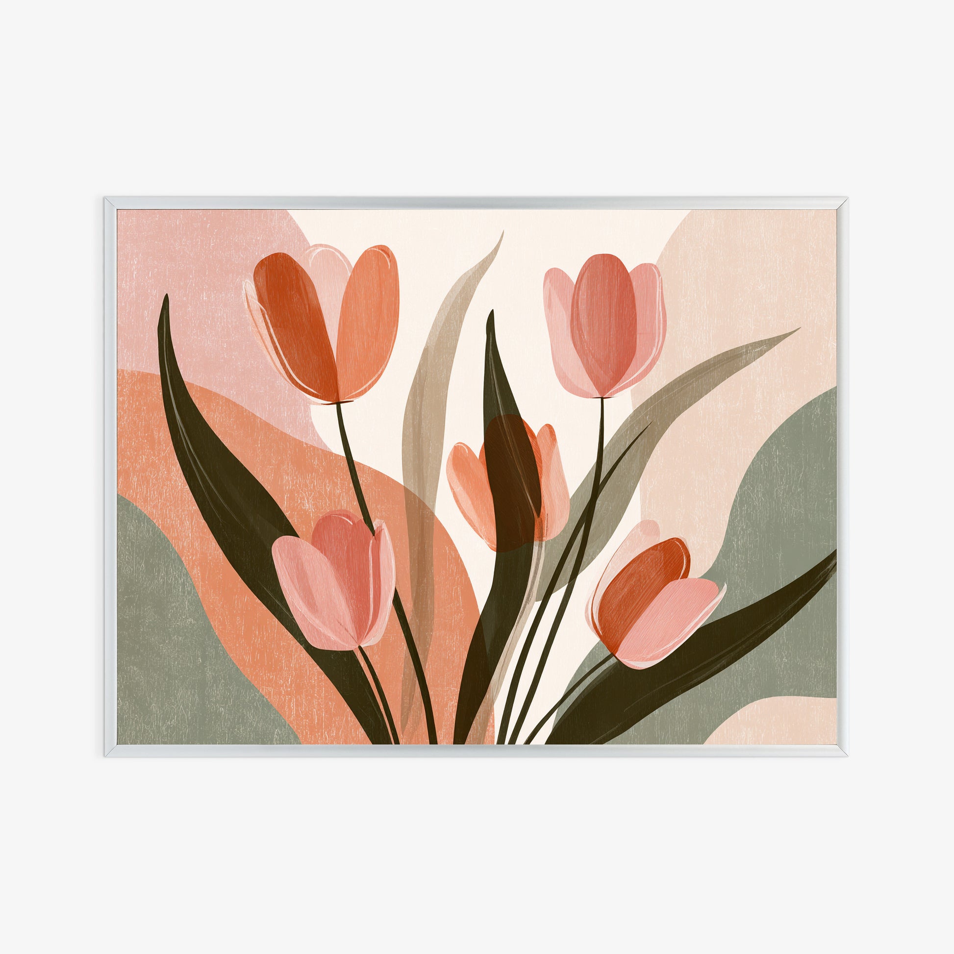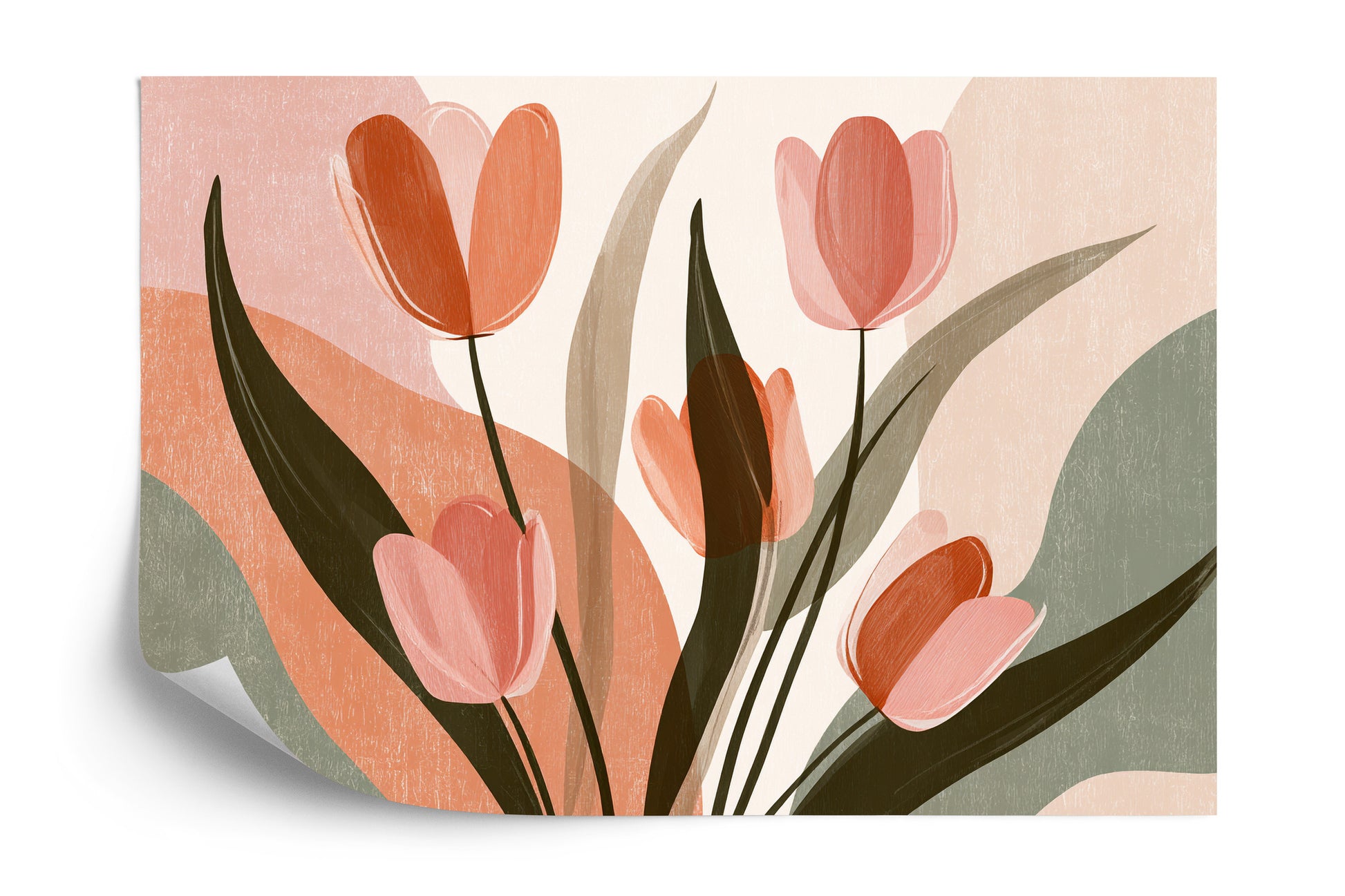 Nowoczesna interpretacja tulipanów w pastelowych barwach. Lekkość kompozycji i subtelne linie nadają obrazowi świeżość i elegancję, czyniąc go idealnym akcentem do wnętrz pełnych harmonii i stylu.