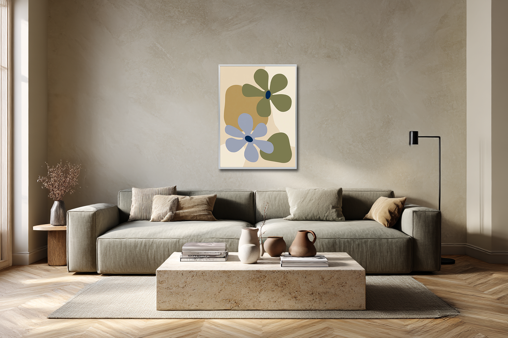 Abstrakcyjna interpretacja kwiatów w minimalistycznej formie. Geometryczne kształty i delikatne kolory tworzą nowoczesną kompozycję, która wnosi do wnętrza świeżość, lekkość i designerski charakter.