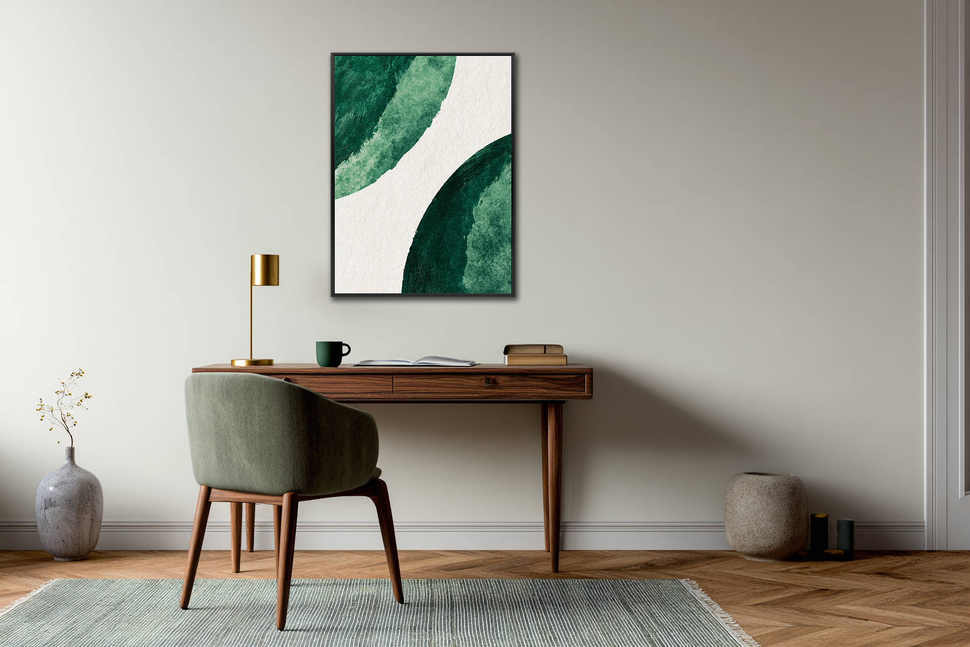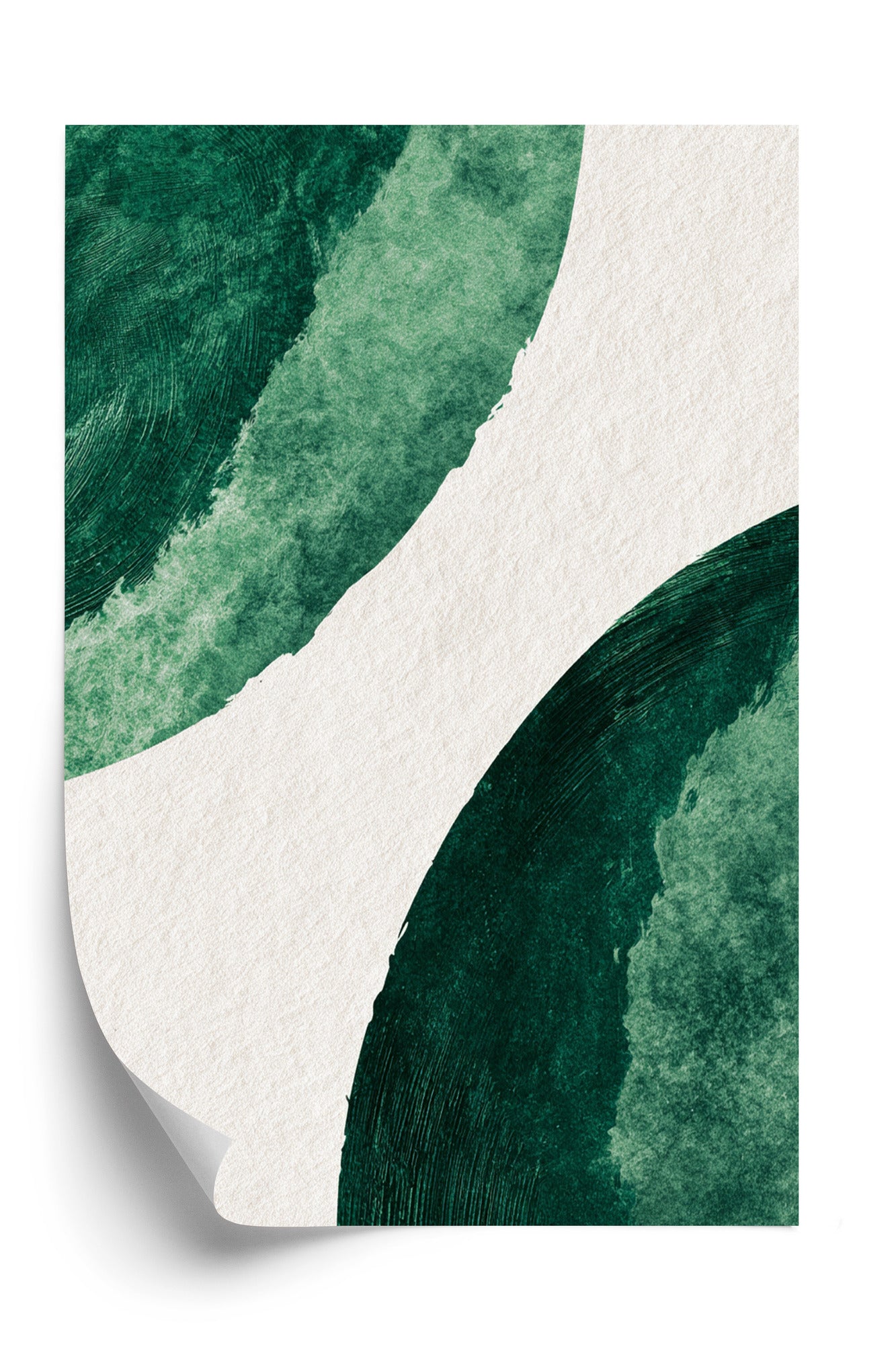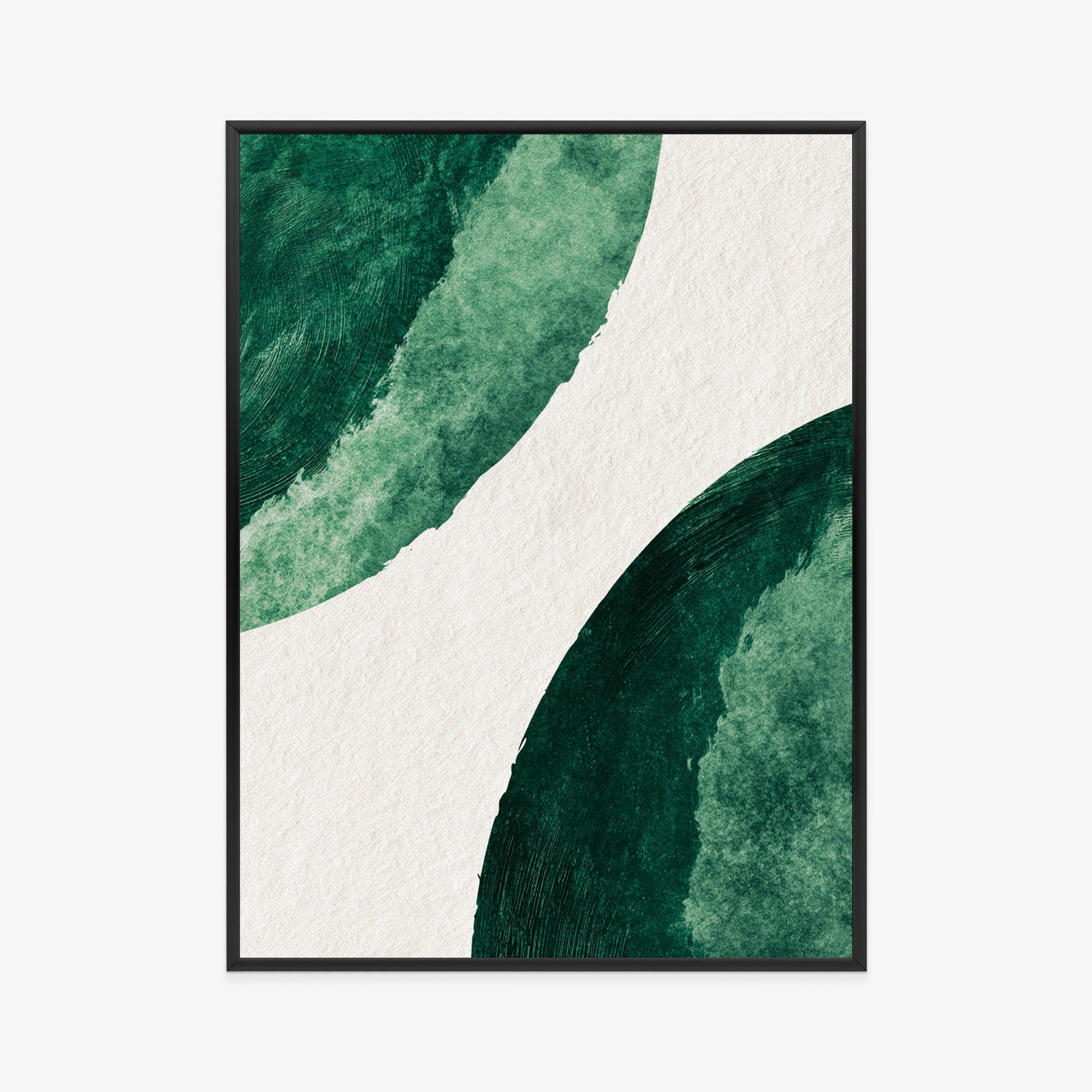 Abstrakcyjna kompozycja inspirowana naturą. Głębokie odcienie zieleni kontrastują z jasnym tłem, tworząc obraz pełen świeżości i minimalistycznej elegancji. Idealny wybór dla wnętrz, które cenią prostotę w artystycznym wydaniu.